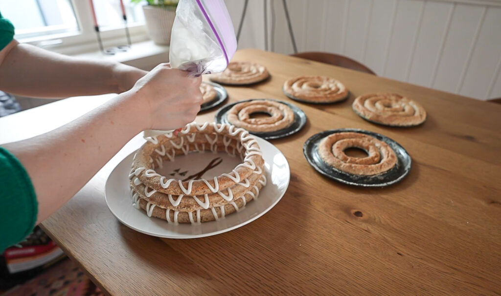 When I was growing up my mom would usually have me roll out the kransekake rings because it’s kind of tedious work but also fun for kids – like playing with play-doh.