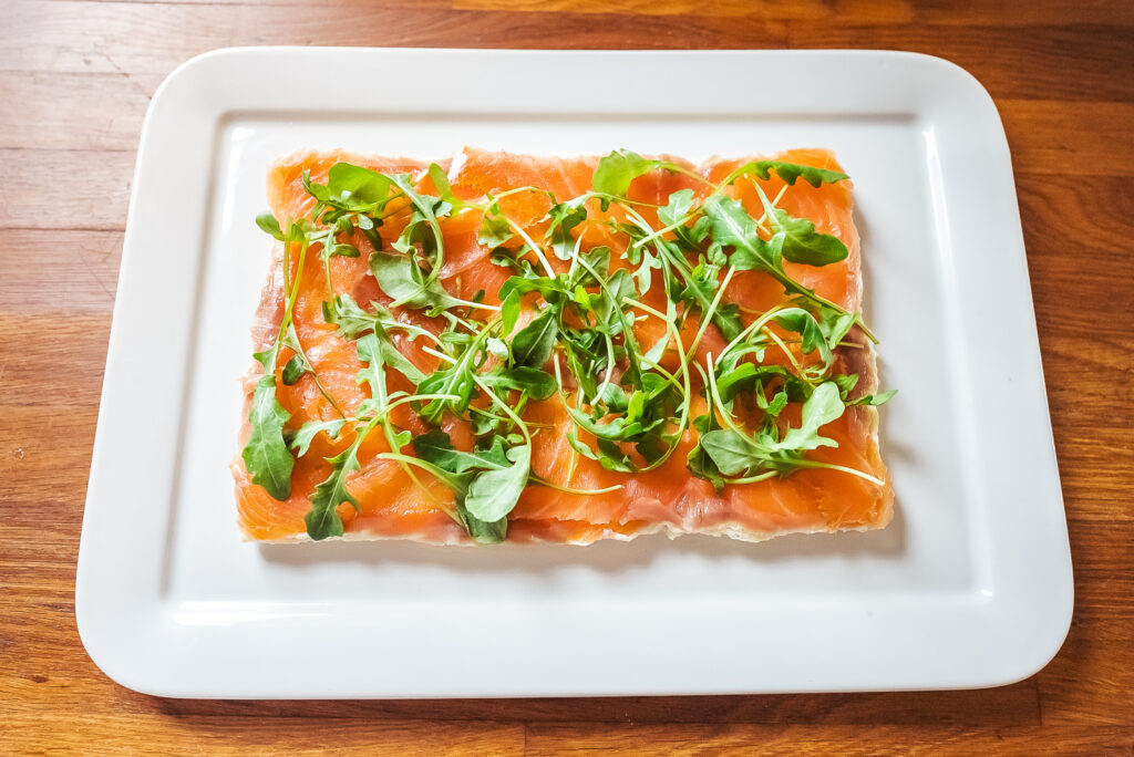 Slice your bread into 24 slices and cut off the crusts. Then arrange the first six pieces on a platter for your first smörgåstårta layer. I like to begin with the smoked salmon layer because it’s flat and sturdy, so it makes a strong bottom layer.