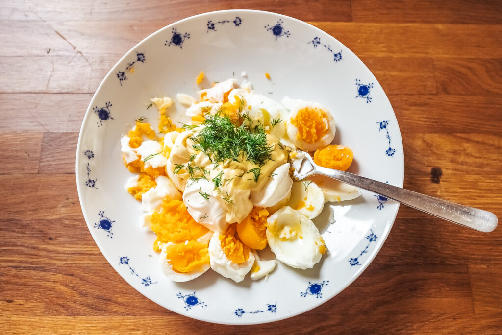- Peel the boiled eggs and mash them together in a bowl with the crème fraîche, mayonnaise, mustard, and dill (or chives).