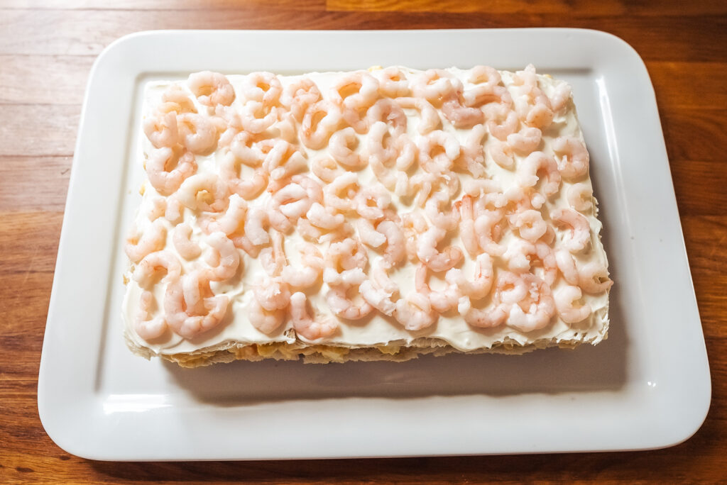 I like to put the shrimp layer at the top because it’s the least stable, so I wouldn’t want it at the bottom of the smörgåstårta. If your shrimp comes in liquid, be sure to pat it dry so that it doesn’t make the bread soggy.