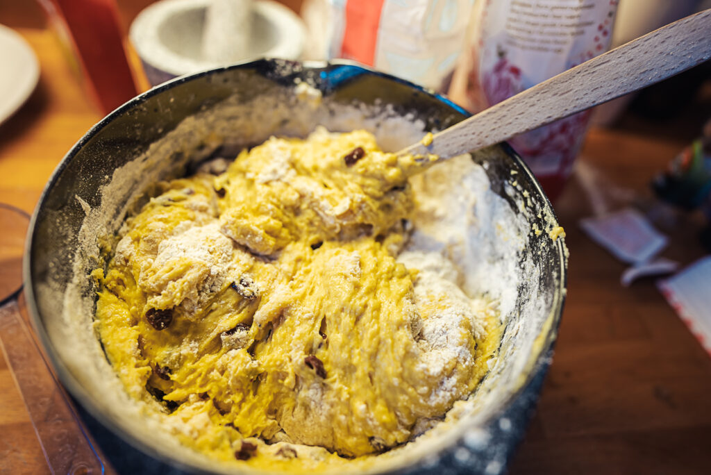 - Sprinkle flour on your counter and knead the dough well. You may need to add extra flour if the dough is too sticky to knead. Cut the dough into four sections and roll each into a cylinder. Cut strips out of the cylinder about the size of two fingers. Roll the strips out and form into lussekatter shapes. Add raisins as decoration.